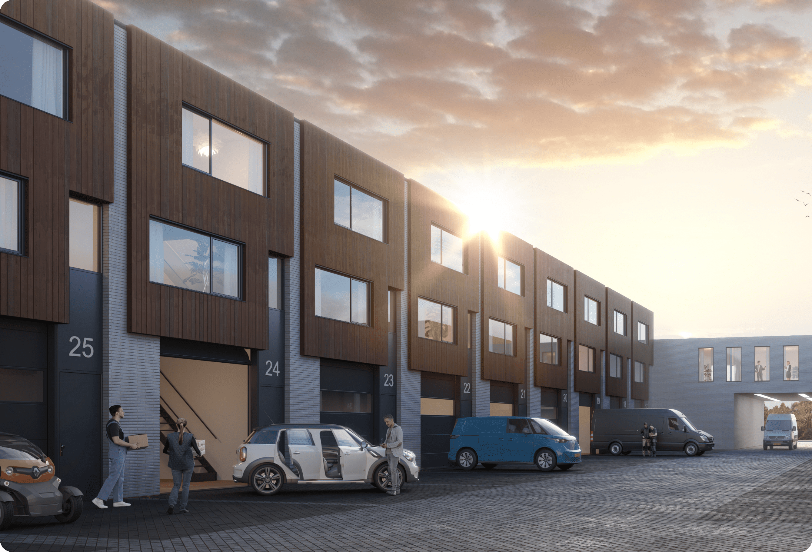 Aan het binnenterrein, het hart van The Brandery, liggen de negen units van het vierde type. Zij zijn allemaal 180 m2 groot en hebben een prijs vanaf €333.000,- excl. BTW. Ze beschikken over twee volwaardige verdiepingen en twee parkeerplaatsen, wat ze geschikt maakt voor een gemengd gebruik. Bijvoorbeeld voor een webshop die kantoor- én opslagruimte nodig heeft. Met deze unit kun je alle kanten op en heb je voldoende werkplekken voor je team beschikbaar.